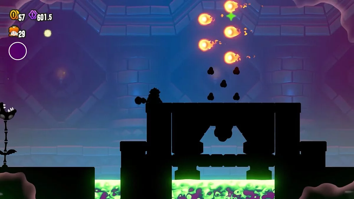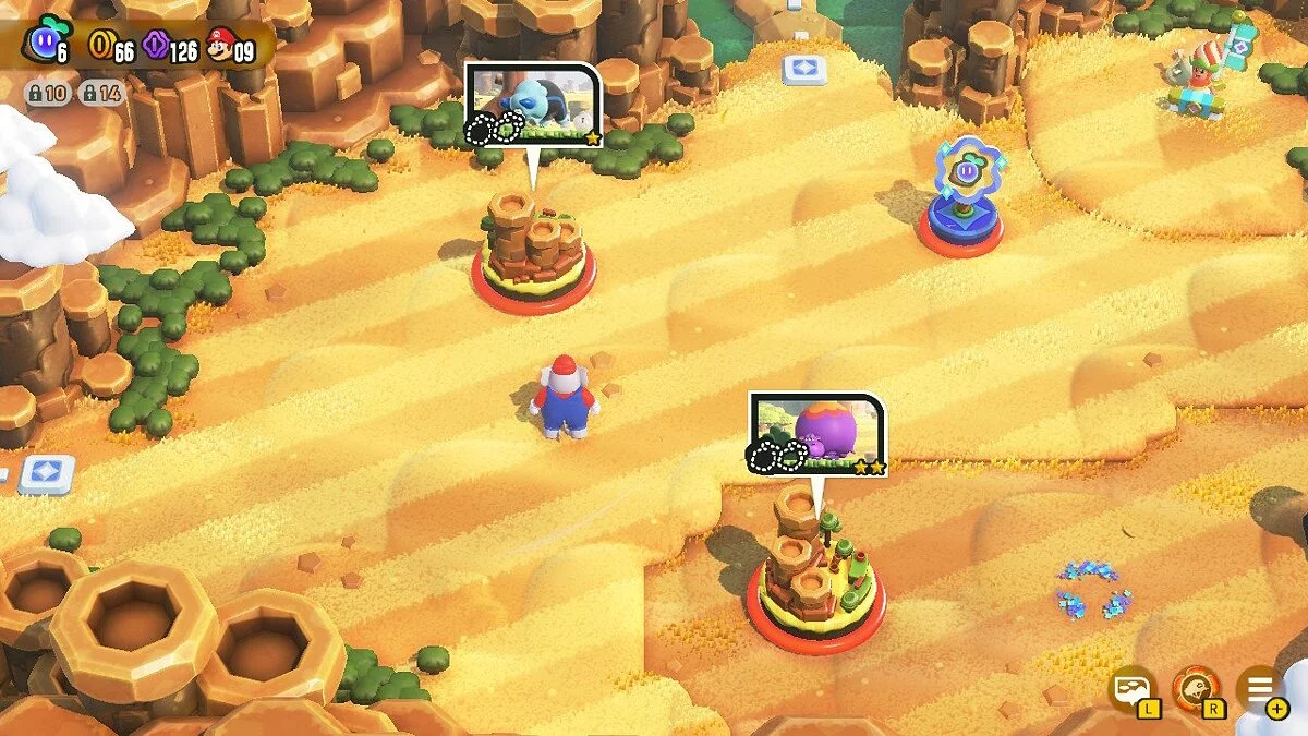 В большинстве случаев на локациях есть два Чудо-семени, которые нужны для полного прохождения. Одно из них находится в самом конце уровня, а другое спрятано в его секретной секции. Чтобы попасть в нее, необходимо отыскать Чудо-цветок, который разработчики могут запрятать в самом неожиданном месте: у противника за пазухой, в невидимом блоке, за границей карты или в трубе, которая в большинстве случаев служит лишь декорацией. Самое интересное заключается в том, что секретные места зачастую меняют привычный геймплей: уровень может превратиться в одну сплошную дискотеку, камера переключится на вид сверху, враги станут чернильными кляксами, а еще Марио превратится в плотоядного гриба Гумба, который не умеет прыгать. Ты, как игрок, никогда не знаешь, что произойдет дальше, поэтому каждая трансформация уровня воспринимается по-особому. Благодаря таким геймплейным изменениям, хочется как можно тщательнее обыскивать уровни и возвращаться на уже пройденные сегменты.
