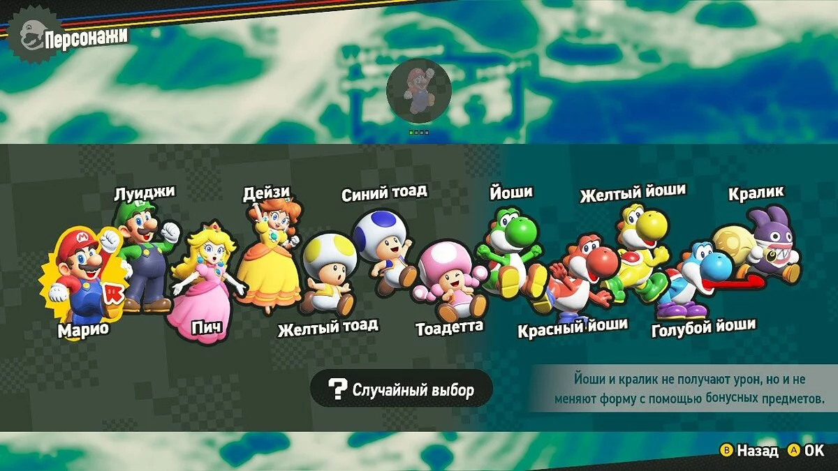 Если в какой-то момент надоест играть за Марио, вы всегда можете выбрать другого персонажа на глобальной карте: Луиджи, Пич, Дейзи или одного из трех разноцветных Тоадов. Если у вас есть младший брат или сестра, которые плохо играют в платформеры, но хотят провести время за игрой, то для них предусмотрена четвёрка неуязвимых Йоши и забавный Кралик, который впервые дебютировал в New Super Mario Bros. U. У каждого героя свой набор уникальных анимаций с неповторимыми движениями и действиями.