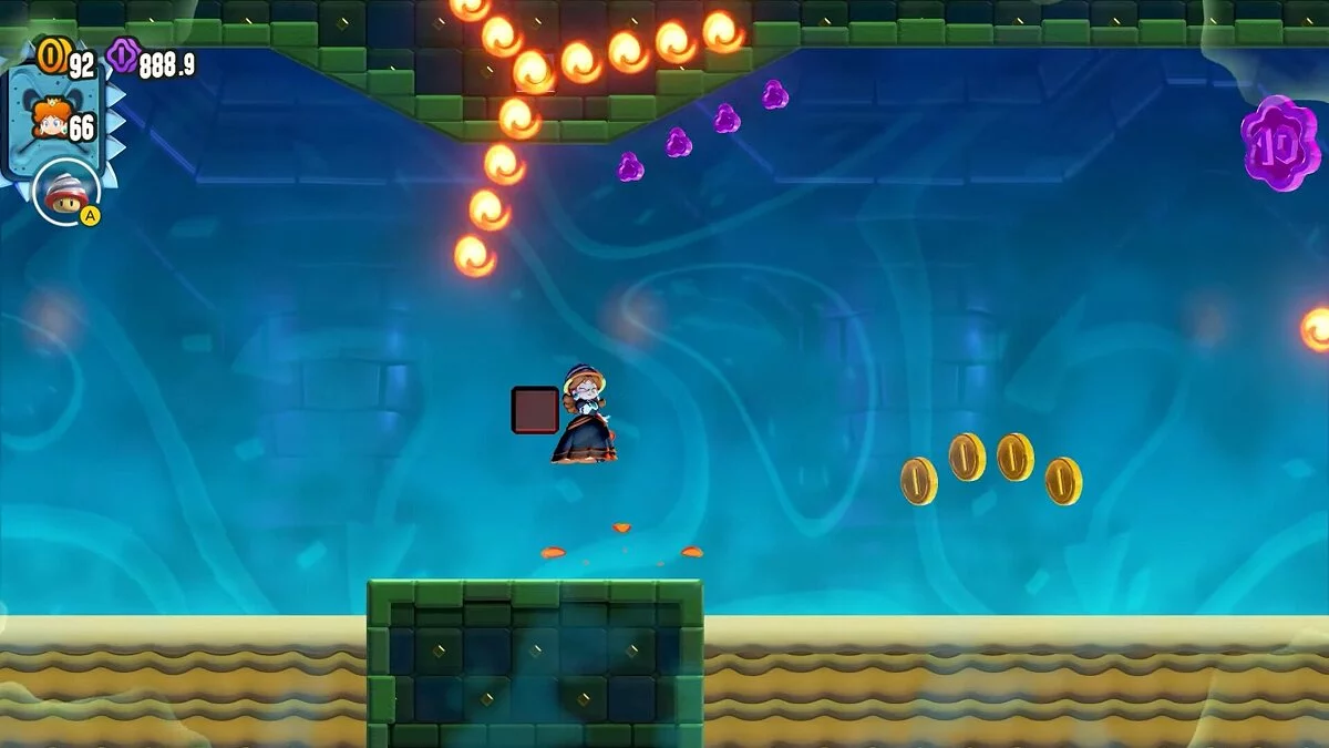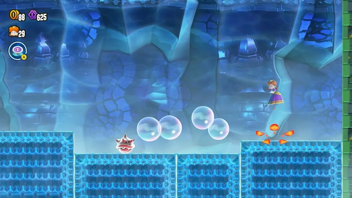 Марио-Пузырь не может похвастаться высокой интерактивностью на локациях, его способности предназначены для более быстрого сбора монет. Пузыри могут ловить монеты, использоваться в качестве трамплинов, а также обволакивать противников, делая их менее опасными. Пузырь и дрель мы использовали реже всего, так как были нацелены на прохождение всех уровней, а не на сбор полезных предметов и секретов. Слон эффективнее в сражениях и в открытии бонусов за счет манипуляции с водой. А самым полезным, по нашему мнению, остается старый добрый образ Огненного Марио, способности которого оберегают от мешающих платформингу противников.