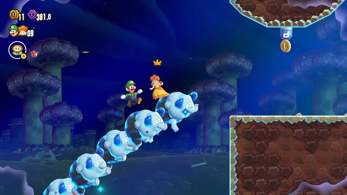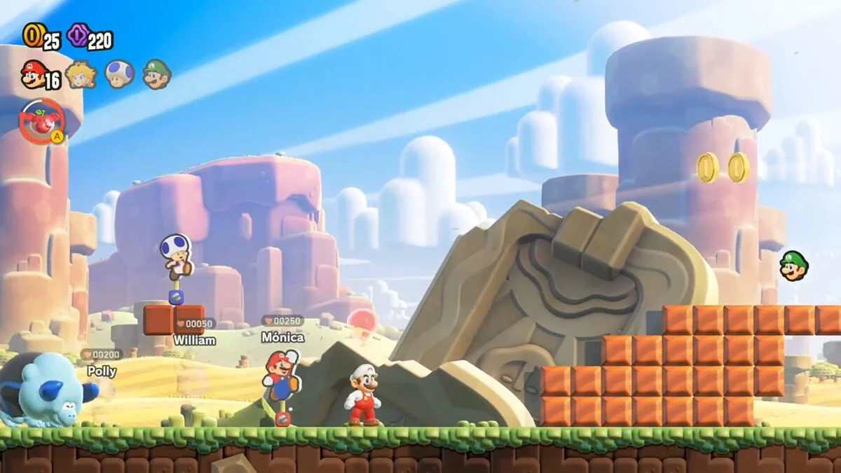 Приятными бонусами Super Mario Bros. Wonder стали локальный кооператив на четырех игроков и совершенно новый сетевой режим, который интегрирован в одиночную кампанию. Nintendo Switch позволяет пройти ту или иную игру в компании за одним экраном, чего нельзя сказать о других консолях актуального поколения, где второй геймпад покупается только для файтингов и футбола. Кооператив в Super Mario Bros продуманный, интересный и с органичным взаимодействием между игроками.