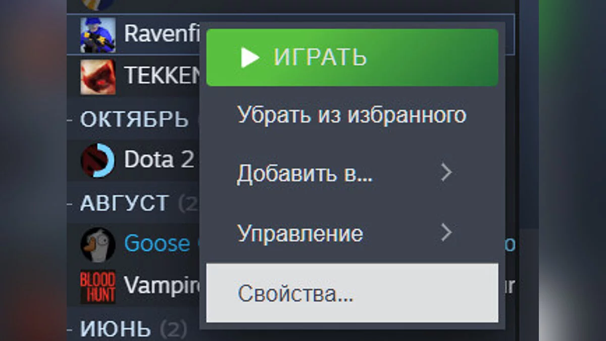 - Запустить Steam, нажать правой кнопкой мыши на Ravenfield и кликнуть «Свойства…».