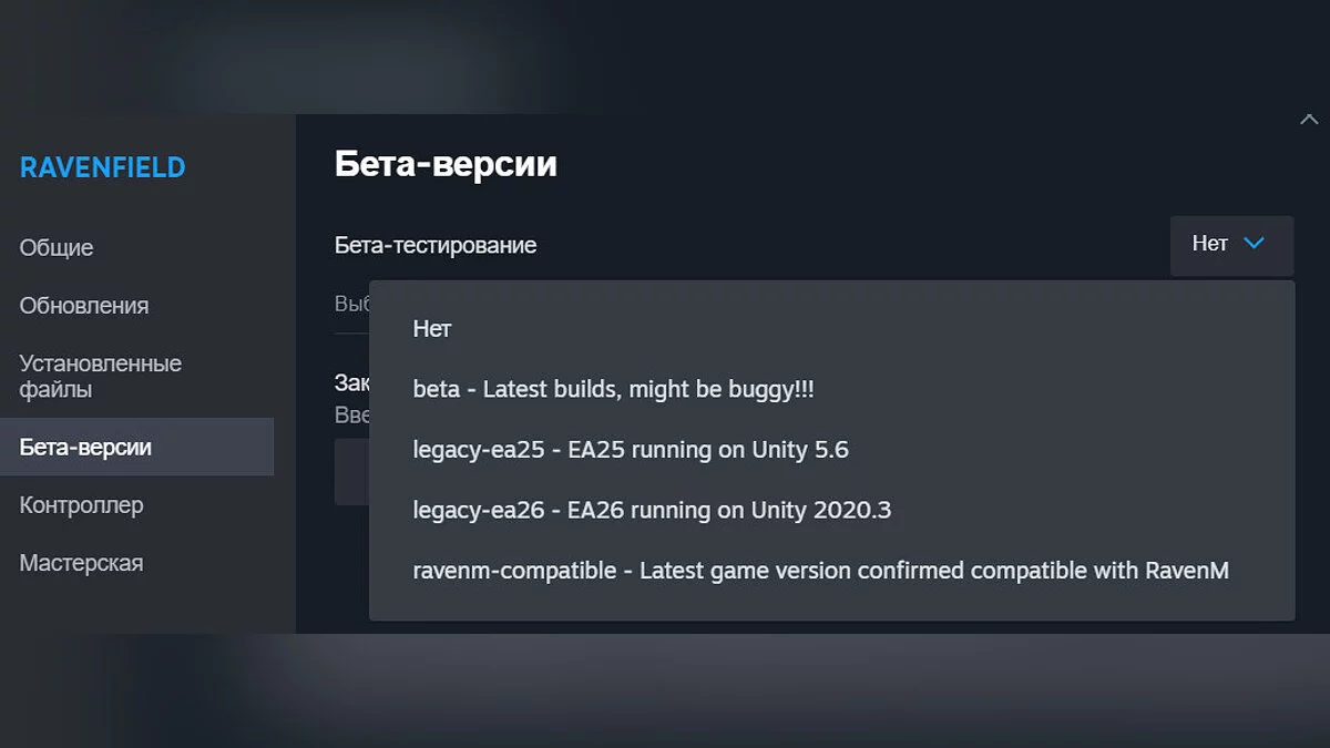 - Перейти на вкладку «Бета-версии», выбрать в меню «Бета-тестирование» одну из ранних версий игры.