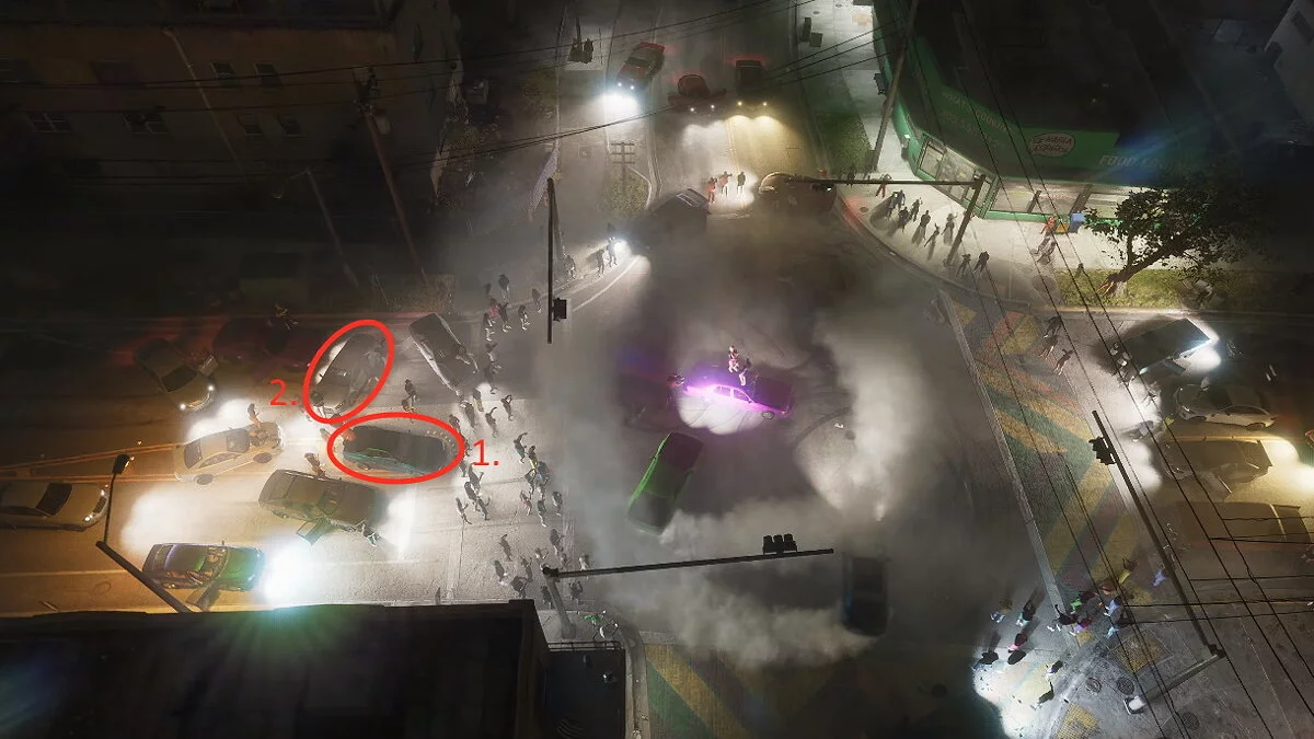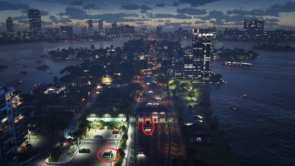 Смотрим на ночной город сверху. Здесь мы можем увидеть два новых автомобиля.