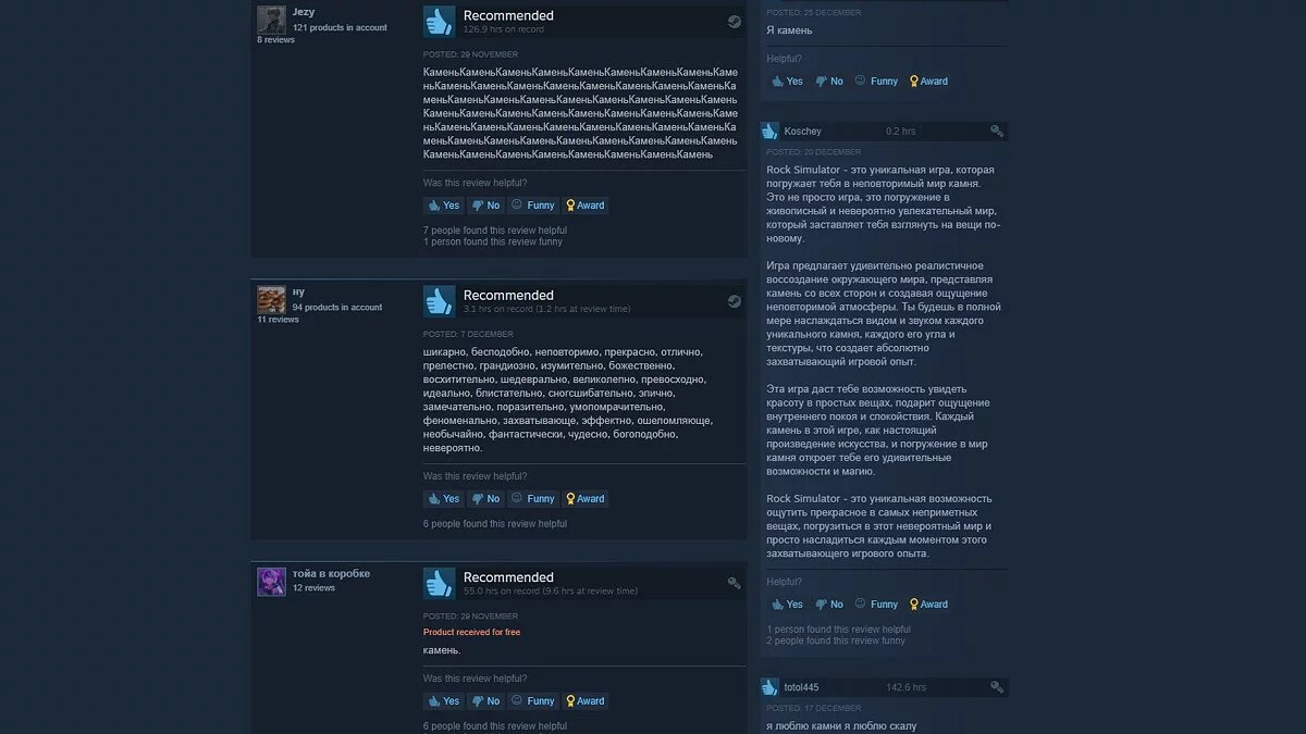 Сложно достоверно выяснить, кому первому в голову пришла идея создать «кринжовый» симулятор, но популярность данной задумки началась с релиза «Симулятора камня». Цель в игре довольно простая: лежать на земле в роли булыжника, слушать звуки природы и ждать чего-то особенного. На словах концепция очень смешная, но разве кто-то в здравом уме купит такую игру? Конечно! Rock Simulator стала настолько популярной, что получила сиквел, мультиплеер и Rock Pass — пользователи в полном восторге. Тысячи положительных отзывов с юморным содержанием, встречаются Steam-аккаунты с сотнями наигранных часов.