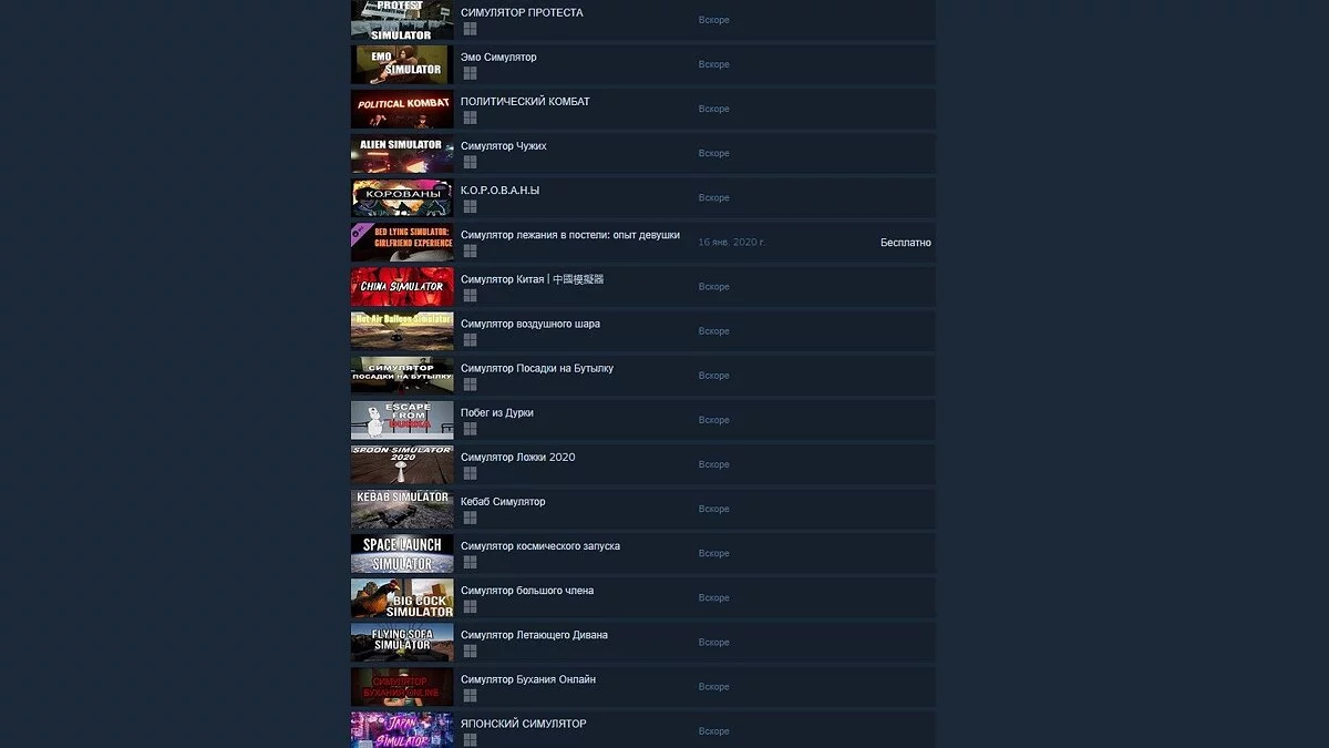 Три года назад мы составили большой топ отечественных треш-симуляторов, среди которых есть такие работы: «Симулятор Бухания Online», «Симулятор сидения у Подъезда», Gopnik Simulator, «Симулятор Прыгания по Гаражам», «Симулятор чистки зубов», Bed Lying Simulator, «Симулятор Купания в Фонтане», Toilet Simulator и еще десяток подобных игр. Забавно, но у издателя Kavkaz Sila Games в закромах еще очень много симуляторов, которые должны выйти в ближайшее время.