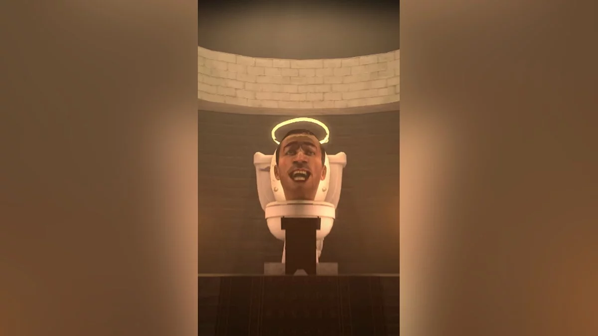 Большой скибидист стоит в центре собора и вещает для десятков маленьких унитазов. В самый разгар его речи забегают камерамены и нажимают на кнопку смыва.