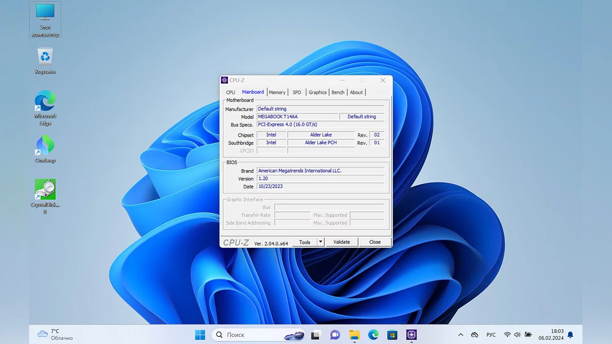 Ноутбук TECNO MEGABOOK T1 мы проверили в синтетических тестах Cinebench R23, CPU-Z и CrystalDiskMark. Результаты на скриншотах.