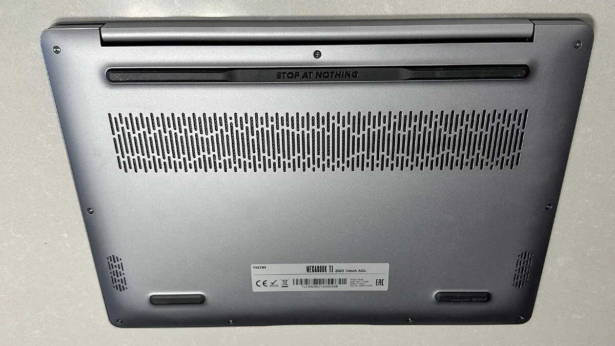 Ноутбук располагается на трёх резиновых ножках, на самой большой из которых можно увидеть девиз компании Stop at Nothing. Здесь же узорчатое вентиляционное отверстие посередине для системы охлаждения и два отверстия для аудиосистемы TECNO VOC, поддерживающей технологию объёмного звука DTS:X Ultra. Похвалить два динамика по 2 Вт особо не за что, им не хватает средних и низких частот, но этого все равно вполне достаточно для ноутбука.