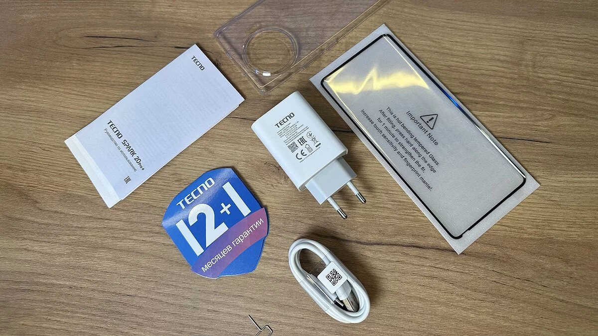 Смартфон встречает нас богатой комплектацией — помимо набора из зарядного устройства, документации, эджектора и силиконового чехла в упаковку также положили защитное стекло. Оно точно пригодится, ведь TECNO SPARK 20 Pro+ обладает AMOLED-экраном с закруглёнными краями. И хотя дисплей может похвастаться защитой Gorilla Glass 5, дополнительная броня ему не помешает.