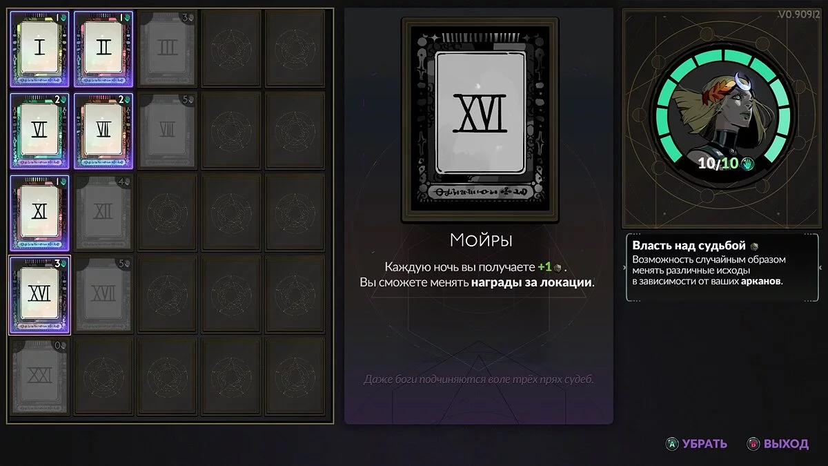 Помимо заклинаний, даров богов и оружия в игре есть еще одна система прокачки — карты Арканы. Перед очередным забегом нужно составить собственную колоду из бафов и способностей, которая должна синергировать с дальнейшим билдом из способностей. Здесь вам и увеличение здоровья с самого старта, и дополнительные ресурсы в начале забега, и усиление урона, и еще много чего полезного. Чтобы открыть новые карты, необходимо фармить вышеописанными способами ресурсы. Вдобавок необходимо прокачивать Мелиною, чтобы она могла носить с собой как можно больше Арканов. Фарм — самая неприятная механика Hades 2, на которую может потребоваться уйма времени. К сожалению, добыча ресурсов тесно связана с механиками по усилению героя, поэтому избежать этой напасти, увы, невозможно.