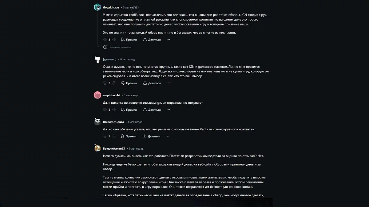 Ни для кого не секрет, что большинство крупных игровых изданий существует на деньги издательств и с рекламы определенных продуктов. Среди геймеров уже давно бытует мнение, что проекты, которые не купили у IGN рекламу, получают стандартные 7 баллов. Оценку ниже получают игры, которые не нашли отклика у общественности. А выше семерки получают рекламодатели. Самый известный пример, который распространяется в комментариях социальных сетей: «Nintendo не была партнером IGN, и ее Switch получила 7 баллов; Valve отказалась от рекламы в IGN, и Steam Deck получила 7 баллов, а сомнительное устройство PS Portal получило 8 баллов, так как Sony уже давно работает с крупнейшим игровым изданием». Недавно приобретенные активы в любом случае будут финансироваться из общего бюджета Ziff Davis и отрабатывать рекламные заказы, с которыми ранее работала только IGN. Нет никаких гарантий, что остальные сайты продолжат высказывать свою точку зрения и не станут использовать «стандартную 7-ку IGN».