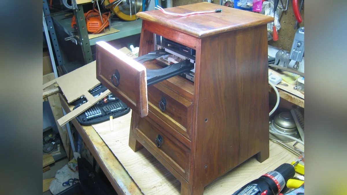 Этот вариант наверняка понравится любителям ретро-мебели. Системный блок разместили внутри винтажной деревянной тумбочки. А в одной из полок находится работающий CD-ROM.