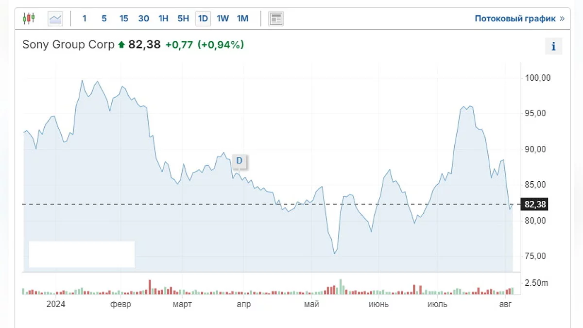 Впрочем, если у Intel и Ubisoft идёт планомерное падение, и сейчас их капитализация достигла минимума, то у Sony регулярные снижения стоимости акций сменяются ростом. Например, даже после кризиса 5 августа они оказались дороже, чем в мае 2024 года.