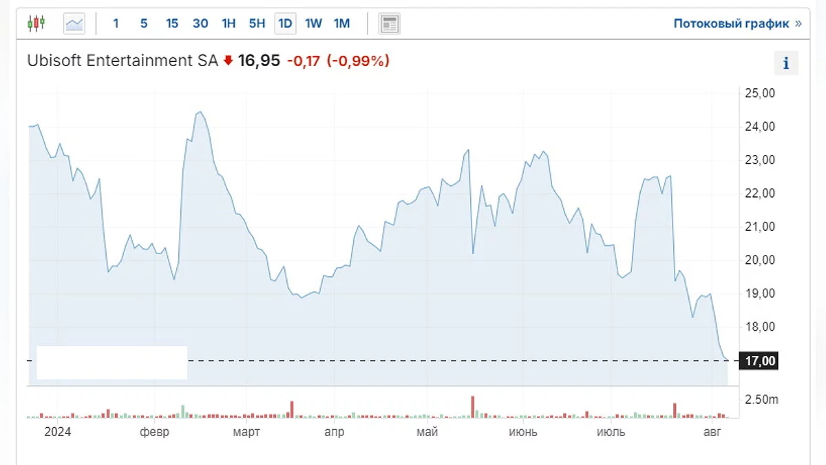 Капитализация Ubisoft планомерно снижалась с ноября 2023 года. Уже к январю 2024-го вместо 30 евро за акцию предлагали всего 19,62 евро. События 5 августа тоже отразились на их стоимости — они упали ещё на 10% и составили 16,93 евро.