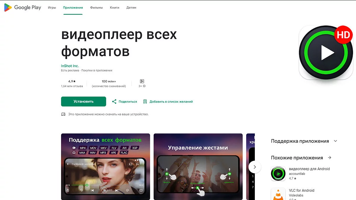 Как понятно из названия, приложение помогает запускать видеоролики любых форматов, работать с их разрешением и настраивать просмотр под себя. Кроме того, разработчики включили в список функций работу с музыкой, которую можно прослушивать как в плеере. Видео и аудио можно редактировать, скрывать от других пользователей, добавлять субтитры и классифицировать по подборкам.