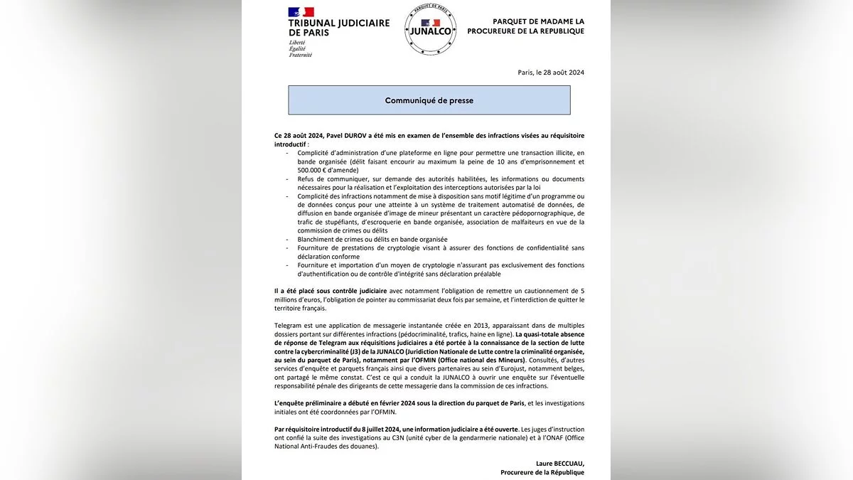 Согласно представителям обвинения, Telegram является приложением для мгновенных сообщений, которое фигурирует в многочисленных делах по различным правонарушениям (п**офилия, незаконная торговля, травля в сети). Практически полное отсутствие ответа со стороны представителей Telegram на судебные запросы было доведено до сведения отдела борьбы с киберпреступностью JUNALCO (Национальная юрисдикция по борьбе с организованной преступностью при прокуратуре Парижа), в частности, OFMIN (Национальное управление по делам несовершеннолетних). Французские спецслужбы консультировались с коллегами из других стран, в частности, из Бельгии, которые сделали схожие выводы. Это побудило JUNALCO начать расследование по поводу возможной ответственности руководителей этого мессенджера в указанных правонарушениях.