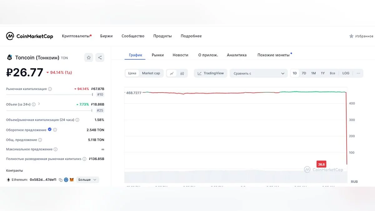 3 сентября, через неделю после ареста Павла, криптовалюта Telegram (TON) обвалилась. За несколько минут её стоимость упала на 93%.