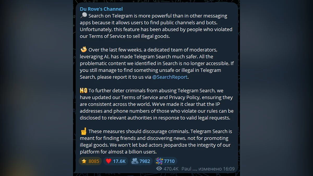 Однако мы слышим голоса, говорящие, что этого недостаточно. Резкий рост числа пользователей Telegram до 950 миллионов вызвал проблемы, которые облегчили преступникам злоупотребление нашей платформой. Поэтому я поставил перед собой личную цель значительно улучшить ситуацию в этом отношении. Мы уже начали этот процесс внутри компании, и я скоро поделюсь с вами более подробной информацией о нашем прогрессе.