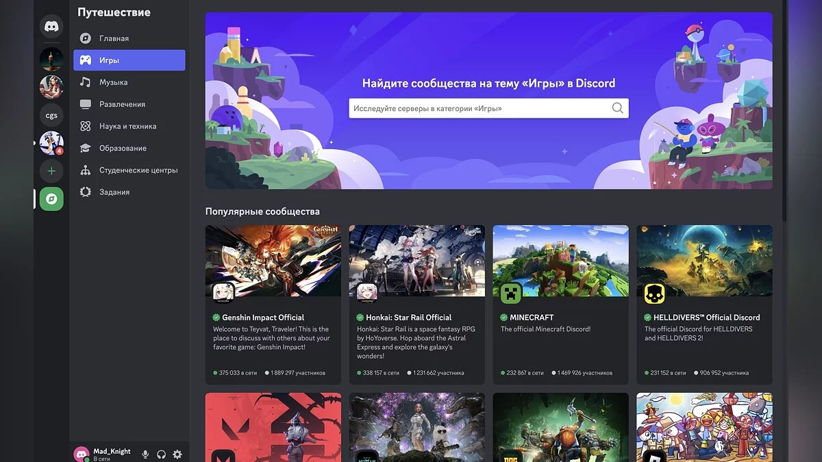 Во-вторых, Discord — это крупнейшая библиотека разнообразных сообществ. Здесь можно найти людей, интересующихся нейросетями, популярными играми и многим другим.