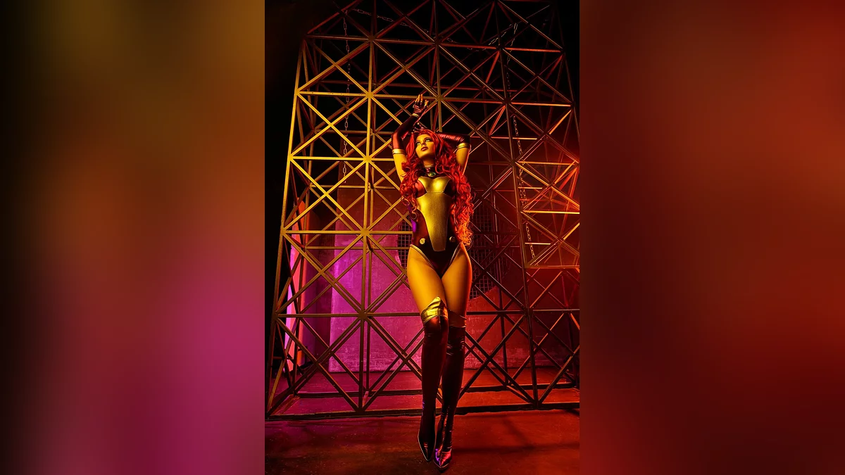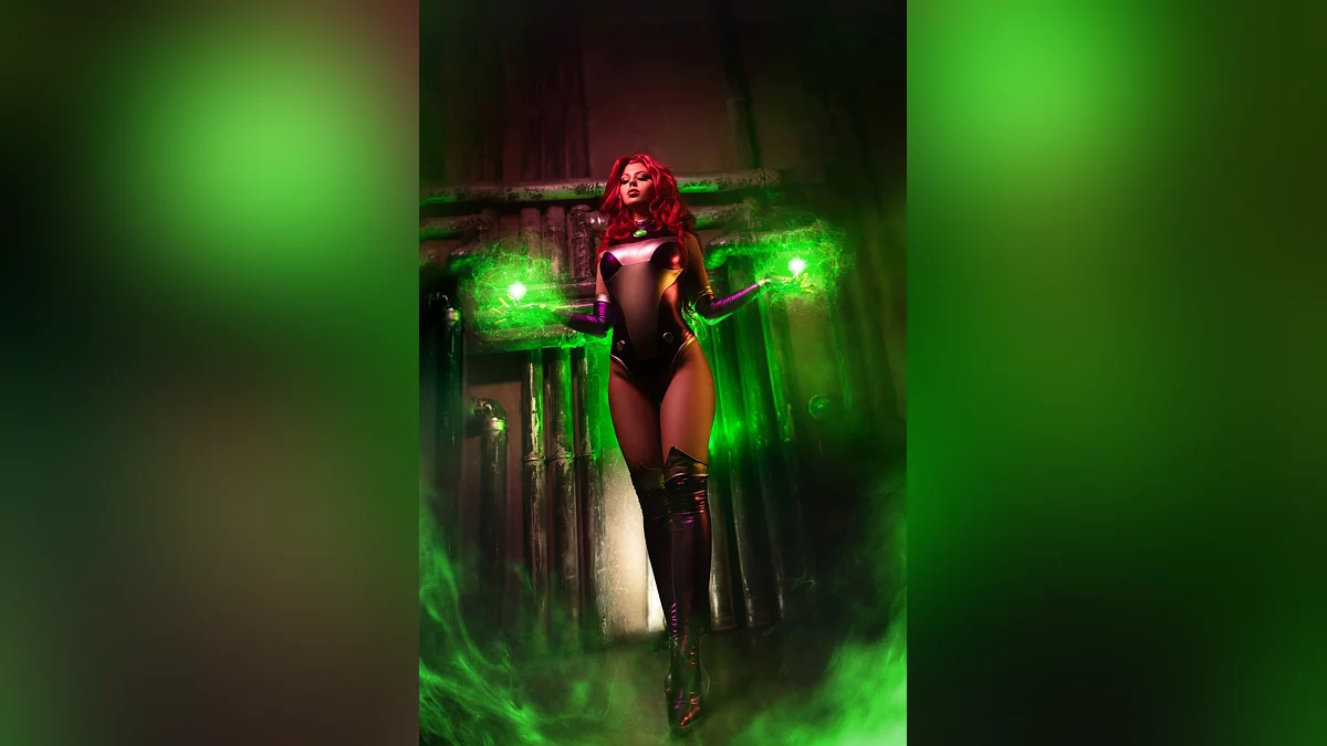 Изначально планировалось провести совместный фотосет с моей подругой Ализой, у которой есть костюм Рэйвен. В процессе подготовки я читала комиксы с участием моей героини Старфайр, прониклась её трагичной судьбой. Её костюмы отличаются в зависимости от художника, но я остановилась на том варианте, который мне показался самым красивым, с перчатками, сапогами и эффектным боди.
