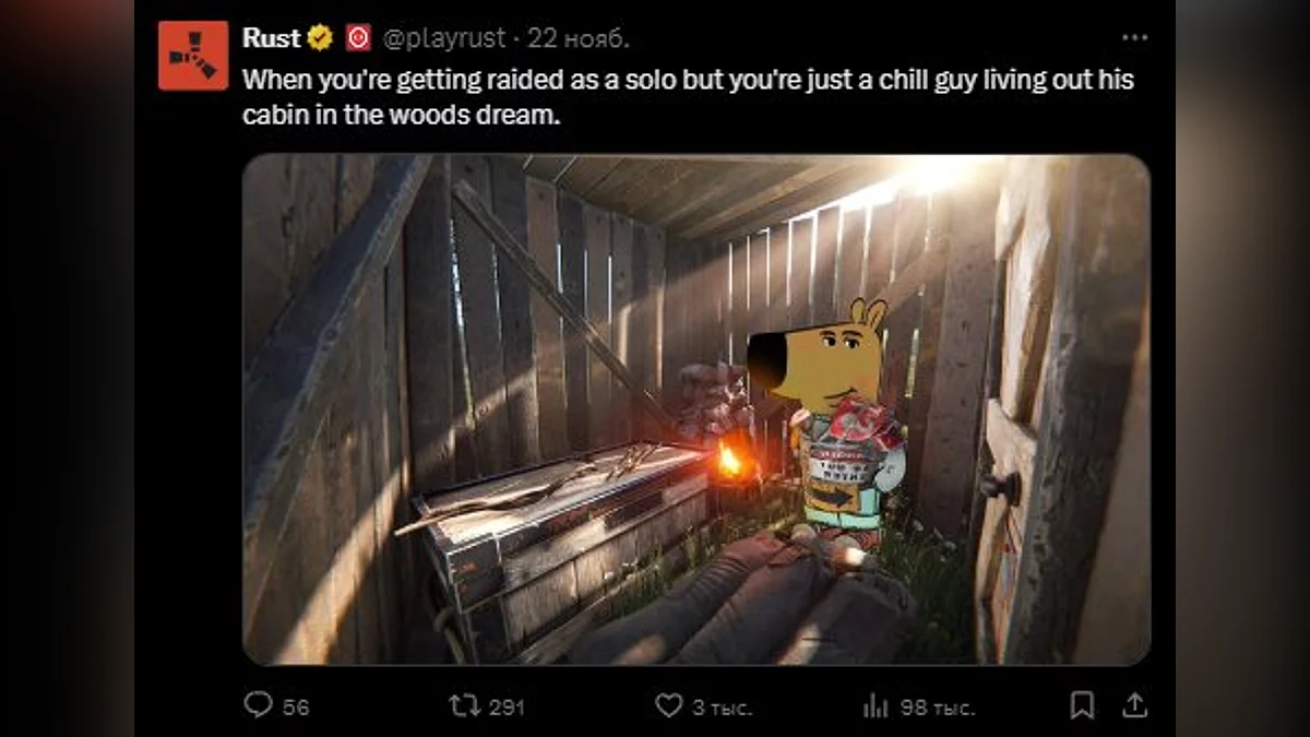 В рунете chill guy также прославился, пусть и немного позже. В основном он обыгрывает неловкие ситуации, когда от героя чего-то ждут, а тот продолжает как ни в чем не бывало себя вести: