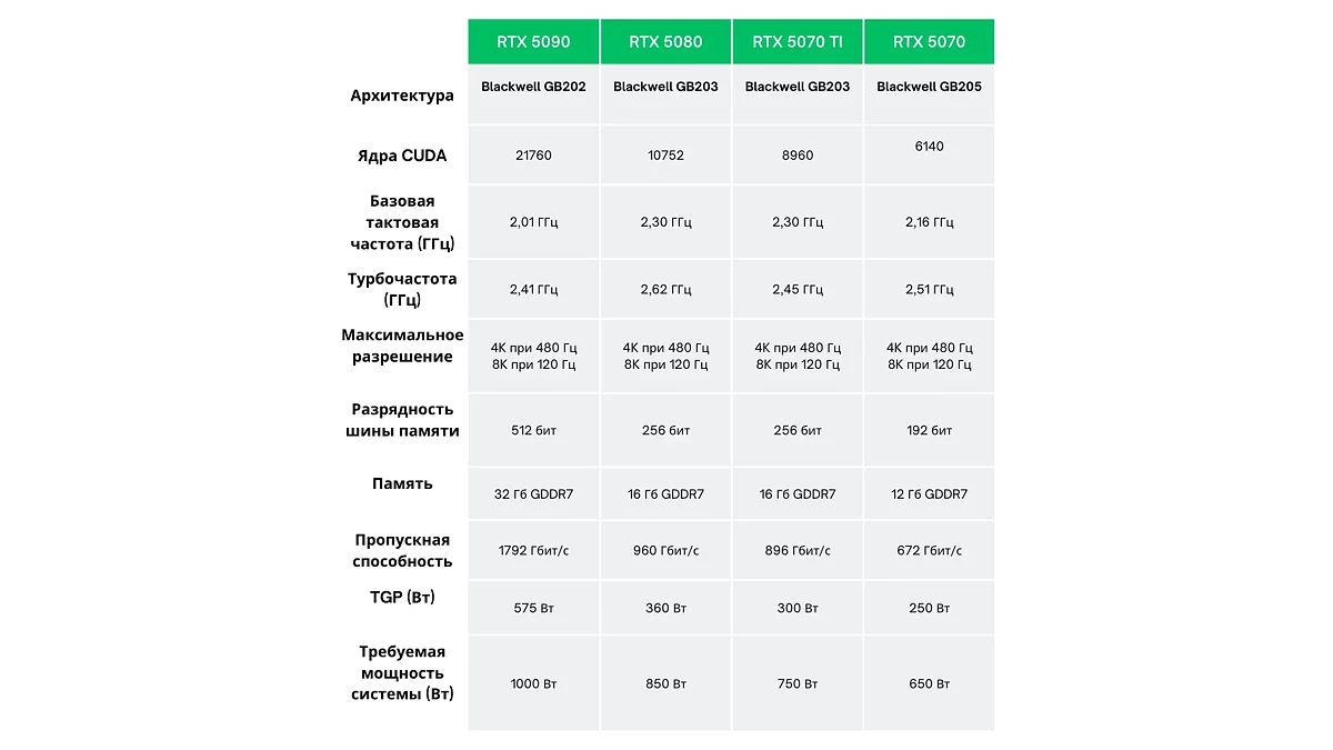 - Снижение цены у RTX 5070 и RTX 5070 Ti по сравнению с предыдущим поколением.