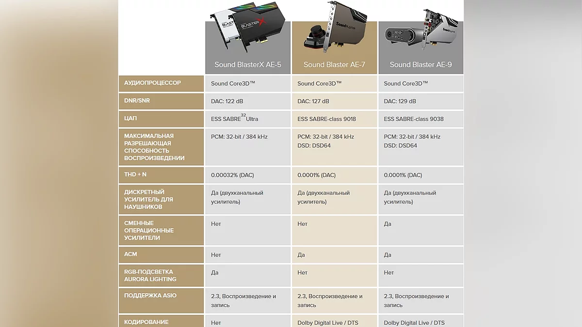 Начать следует с хорошего источника в виде звуковой карты. Именно ЦАП и усилитель являются наиболее важным и точным звеном в воспроизведении звука. Гораздо более чем выбор самих излучателей звука. Выбор пал на продукцию от Creative Technilogy серии SoundBlasterX AE, поскольку приобретается на полноразмерный десктопный ПК. Эта серия в настоящее время имеет три модели: AE-5, AE-7 и AE-9. Я выбрал AE-5, потому что не увидел особого смысла переплачивать за более дорогие модели, заметной разницы в качестве звука не будет. Внешние модули на стол у моделей AE-7 и AE-9 кажутся удобнее, но, немного подумав, решил обойтись без них. У старшей модели AE-9 странный формат. Частично она на столе, частично по проводам ведёт на модуль PCI-E разъёма в корпусе компьютера. Что, на мой взгляд, странно. Либо на столе место занимать, либо внутри компьютера, но не везде сразу. Первая ревизия AE-9 показалась ненадёжной. Плохо припаянный коннектор в скором времени отваливался. Кроме того на младшей модели AE-5 нету внешних блоков управления. Значит — никакие кнопки, крутилки и экранчики-дисплеи не износятся со временем. Да и особой надобности в них нет, ибо карта используется только с компьютером, интерфейс управления которой удобно использовать через специальное приложение, а регулировать громкость так и вовсе на клавиатуре. У карты имеется RGB подсветка и светодиодная лента в комплекте для размещения внутри корпуса с прозрачной стеной, дабы светилось ещё ярче всеми цветами радуги. Подсветка опциональна и ленту тоже необязательно присоединять. Питания достаточно от одного порта PCI-E x1. Имеется кабель подключения к передней панели корпуса выходов на наушники и микрофон. О прочих особенностях и софте рассказывать не буду. Иначе это станет уже не моя статья. Информация есть на официальном сайте Creative.