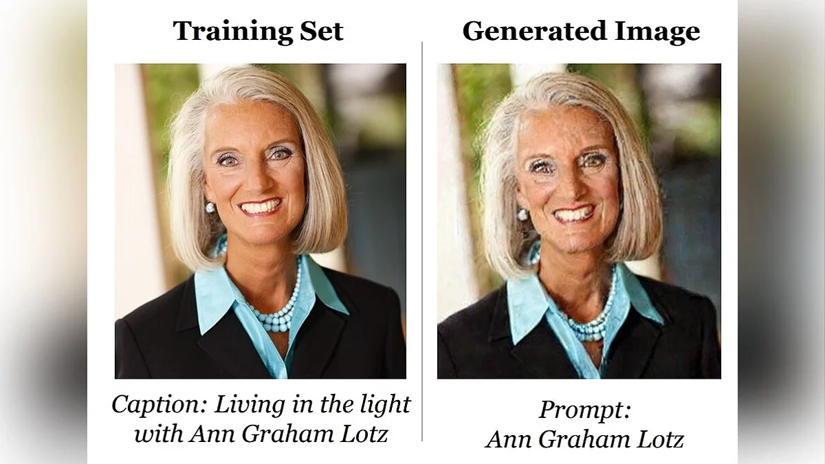 В исследовании «Extracting Training Data from Diffusion Models» проведённом сотрудниками Google, DeepMind, ETH Zurich, Princeton, и UC Berkeley, выяснили что при определённых стечениях обстоятельств, нейросеть может выдавать изображения очень близкие к оригиналу. Например: