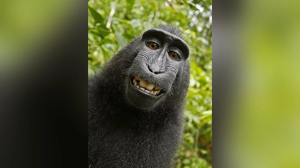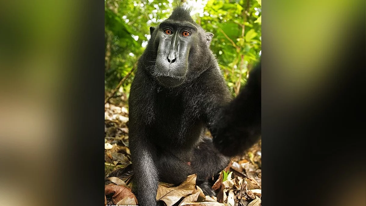 2011 год. Фотограф Дэвид Слейтер отправился в Индонезию, что бы сделать снимки хохлатых павианов обитающих в заповеднике. Пока фотограф был занят своими делами, макака завладела камерой и нажала на кнопку. Звук привлёк внимание обезьяны и она продолжила нажимать на неё. Было снято много снимков, но хороших получилось мало. По прибытии с заповедника, Слэйтер лицензировал изображение Caters News Agency, на том основании что он, являлся автором идеи и специально хотел чтоб мартышки поиграли с камерой. Он утверждал что всё было в его поле зрении и всё вышло как и задумывалось. Вначале статья об этом появилась на DailyMail, а после вызвала обсуждения на сайте Techdirt, когда там вышла статья о том, может ли фото сделанное обезьяной — быть объектом авторского права. В статье присутствовало 3 фото обезьяны.