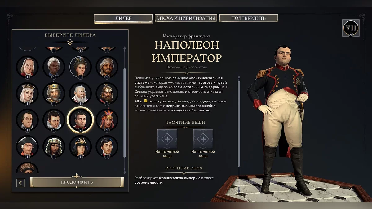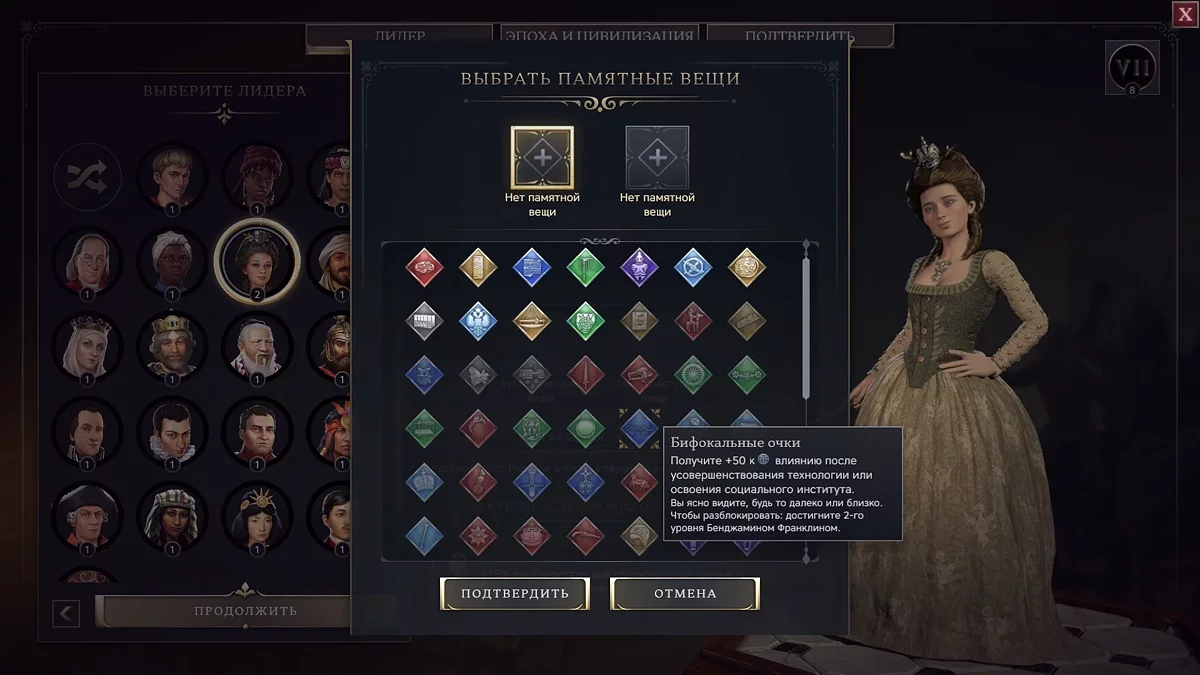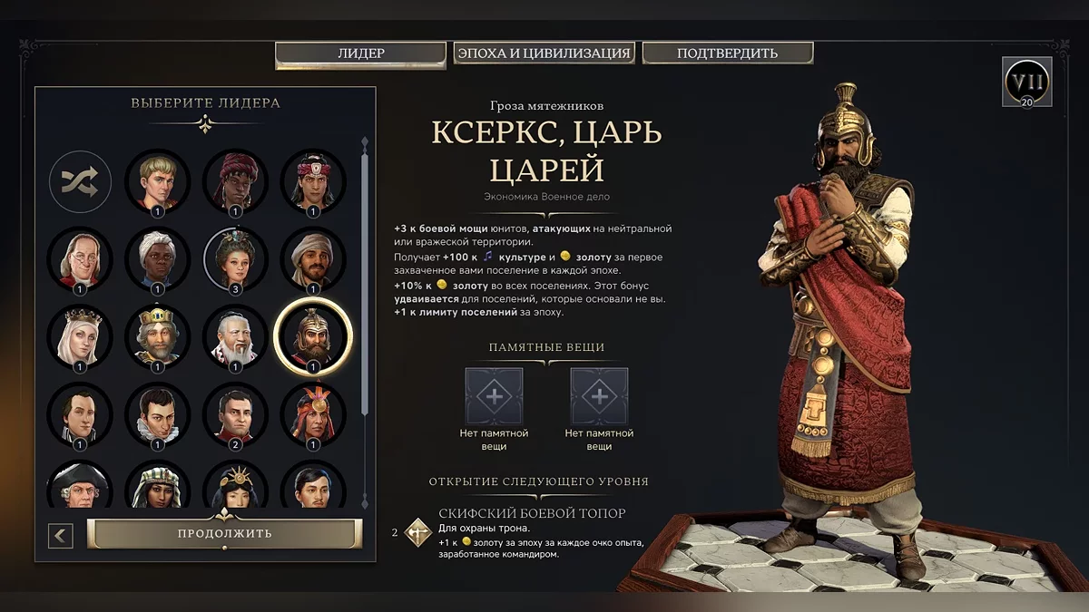 Тут же, при выборе правителя, в глаза бросается еще одно нововведение. «Памятные вещицы». Это такие артефакты, которые можно открывать по ходу игры. Правда, нужно сначала зайти в аккаунт 2K. Тогда появляется мета-элемент прокачки не только в рамках одной партии, но и в игре в целом. Бонусы у некоторых прямо очень внушительные, но пока играем без них.