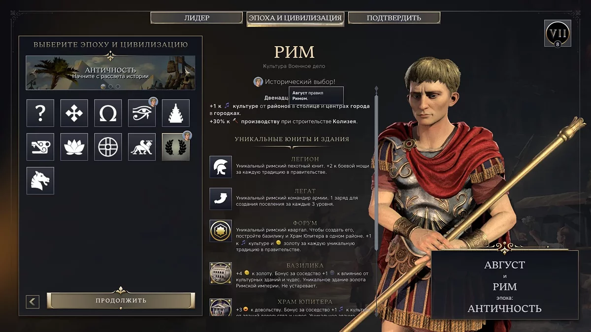 Самое основное, то, о чем разработчики говорили еще до релиза, — эпох теперь всего три. Античность, эра исследований и современность. У правителей бонусы от эпохи к эпохе могут разниться. У одних огромный буст на старте, но зато в последующих эрах они слабее. У других наоборот.