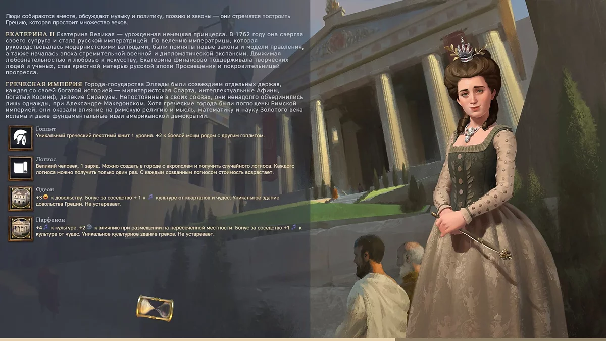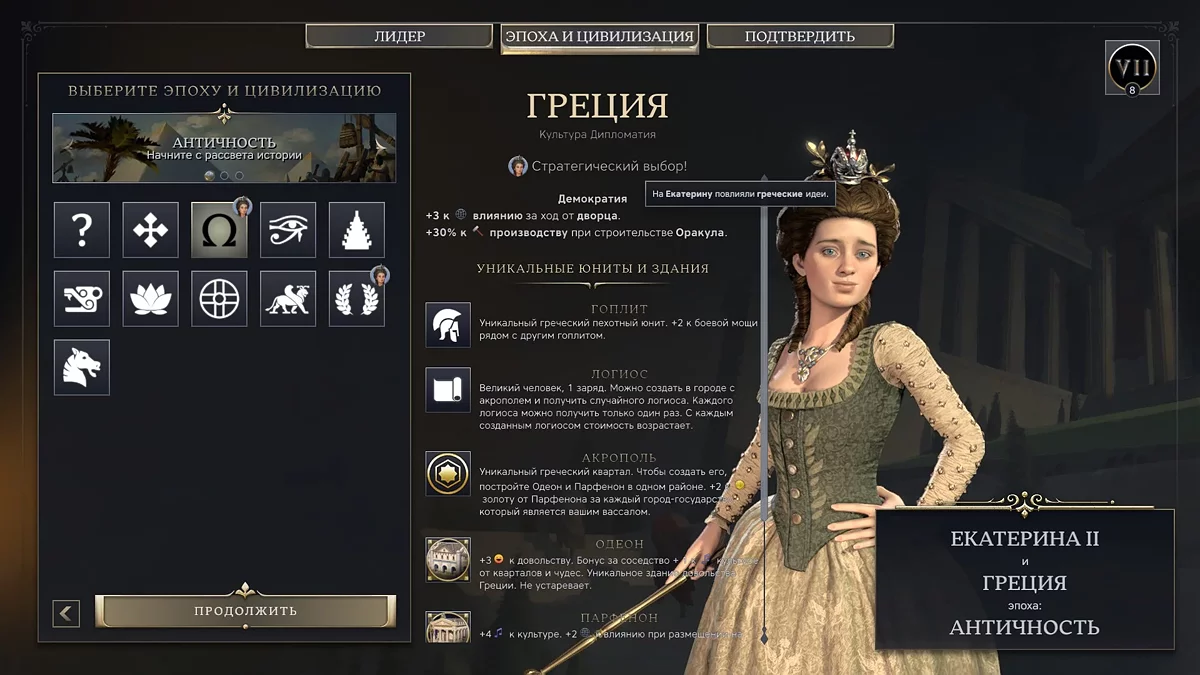 Мы тоже останавливаемся на таком «стратегическом» выборе и берем Грецию. Разработчики пишут: это логично, потому что Екатерину вдохновляли греческие идеи. Но нас, впрочем, больше привлекли бонусы к культуре. И вот партия начинается.