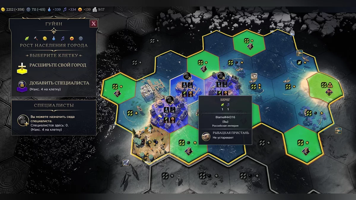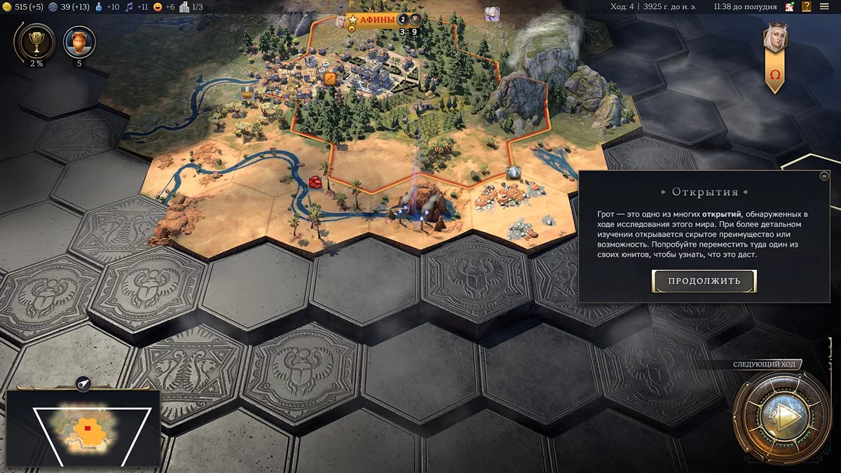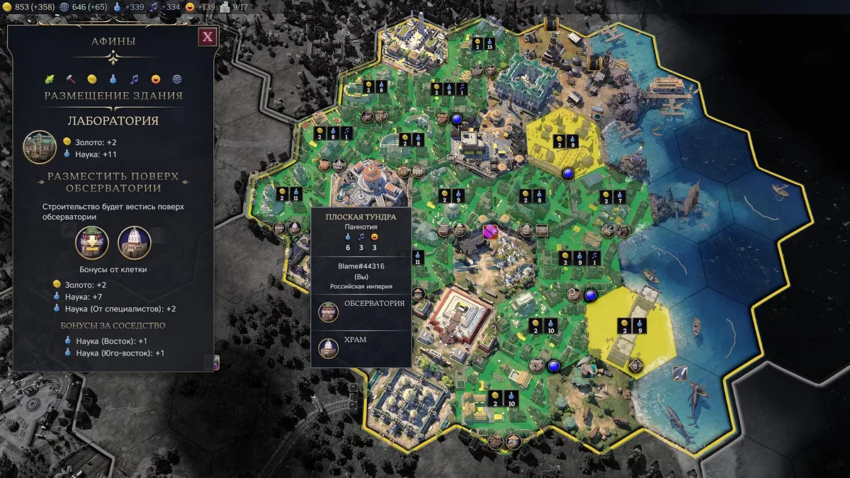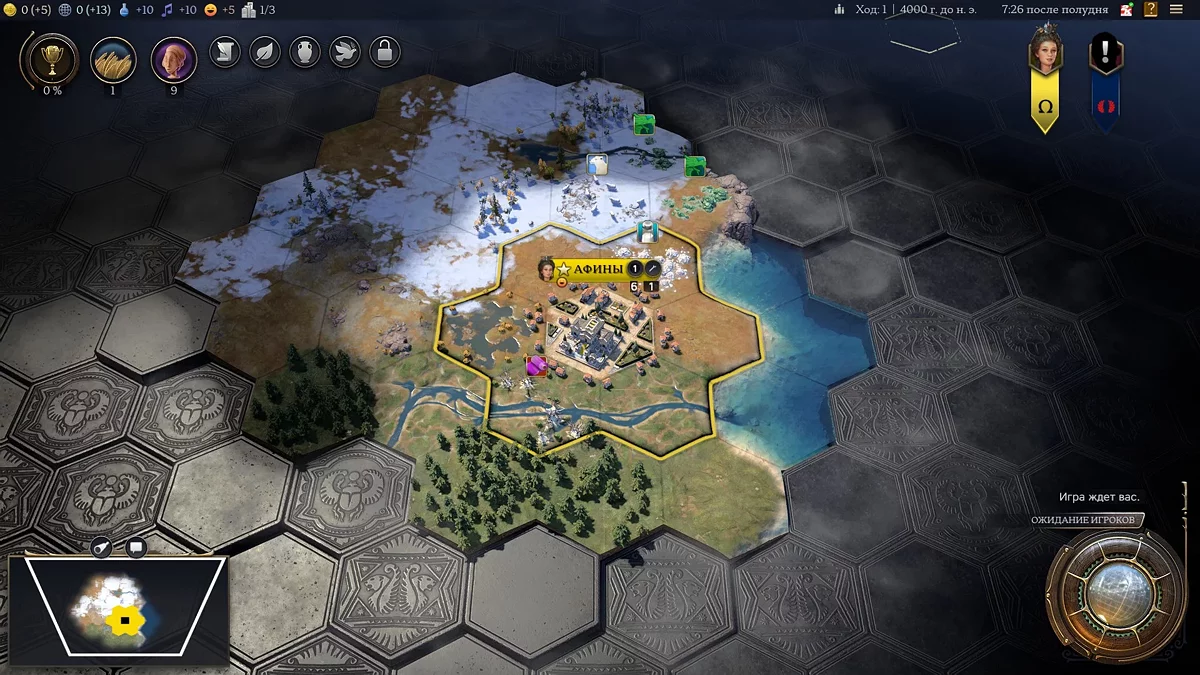 И вот в холодной тундре — путь Екатерины II в силу географических бонусов начинается именно здесь — появились Афины. Начинаем знакомиться с тем, как в седьмой «Цивилизации» реализовано развитие города. И снова понимаем, что все по-другому. Рабочих больше нет в природе, вместо этого каждый раз, когда появляется новый житель, нужно выбрать, какую клетку улучшить.