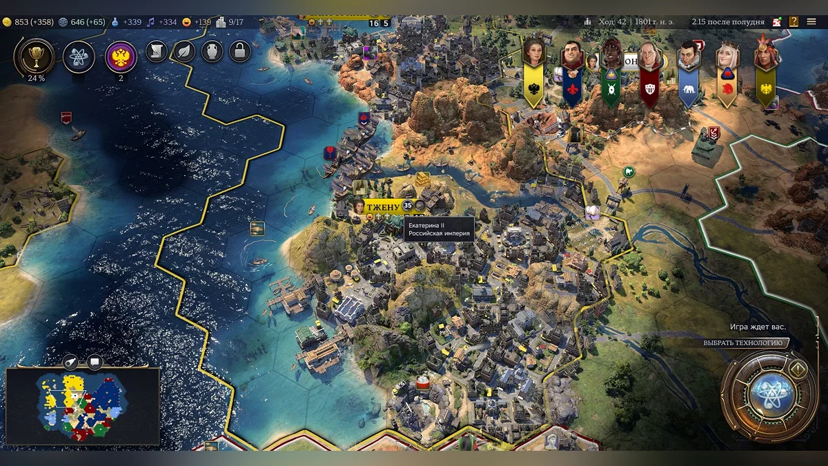 Когда пришло время опробовать игру, мы остановились на вернувшемся правителе — Екатерине II. В последний раз она фигурировала в пятой части «Цивилизации» и была очень хороша, даже, возможно, слишком. В плане бонусов с Россией мало кто мог потягаться, и, сказать честно, в седьмой части ситуация схожая. У императрицы крайне сильные бонусы к науке и культуре, двум столпам развития цивилизации.