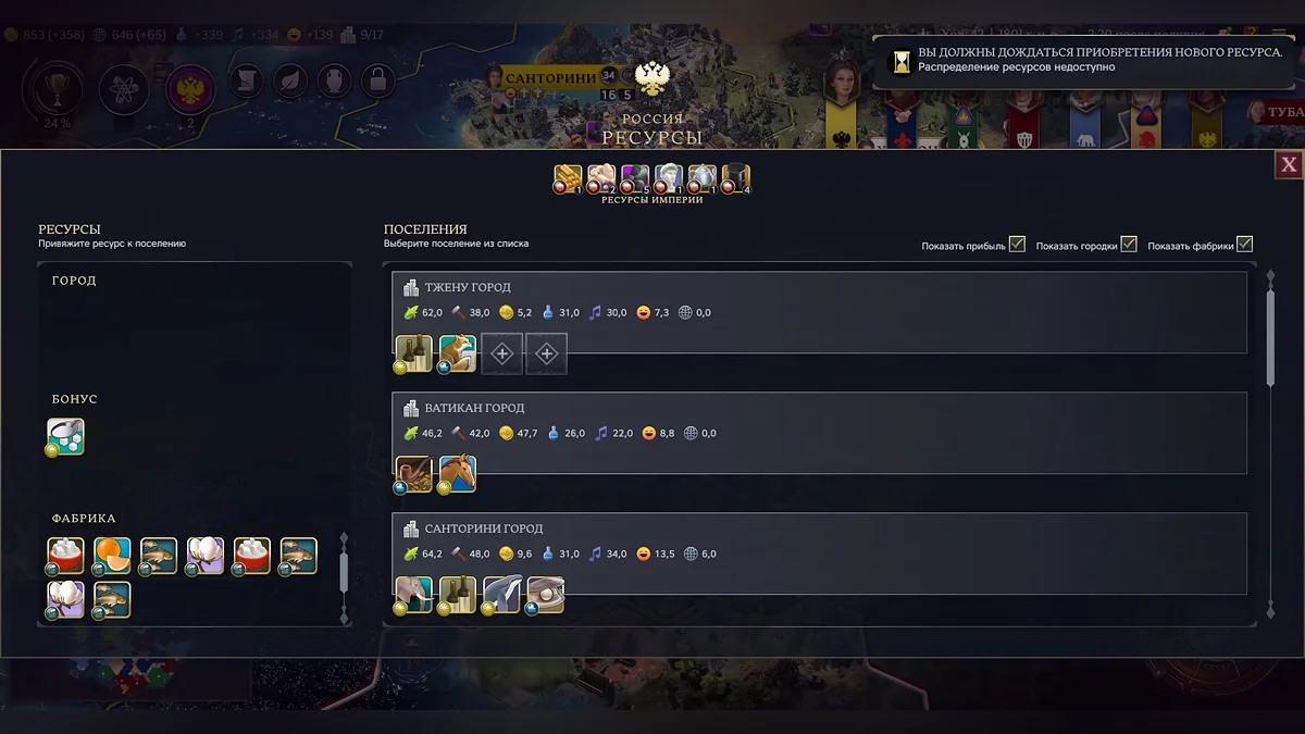 Ресурсы в Sid Meier's Civilization 7 тоже работают совершенно по-другому. Делятся на основные, которыми нужно бустить города, бонусные, которые можно размещать в городках, и ресурсы империи. Они влияют сразу на всю страну. Позже еще появляются ресурсы фабрики.