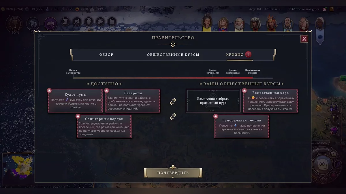 Путь к победе в новой «Цивилизации» лежит через, как уже говорилось, три эпохи. То есть стал короче, но зато тернистее. Есть прогресс эпохи, который идет вперед по мере того, как государства открывают новые технологии и социальные институты. И ближе к концу эры сталкиваемся с новой механикой, которую Firaxis, кажется, тоже позаимствовала у Paradox Entertainment, — кризисами.
