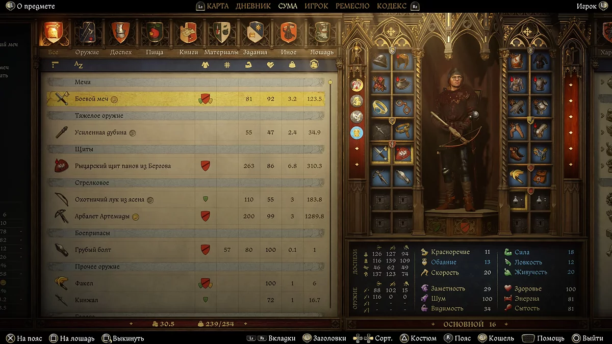 В Kingdom Come: Deliverance 2 эту систему проапгрейдили до совершенно иного уровня. Купить снаряжение нужно трех разных видов — для боя, разговоров и стелса. При этом в каждой группе характеристик есть свои дополнительные статы. Что вам будет важнее — бесшумность или незаметность?