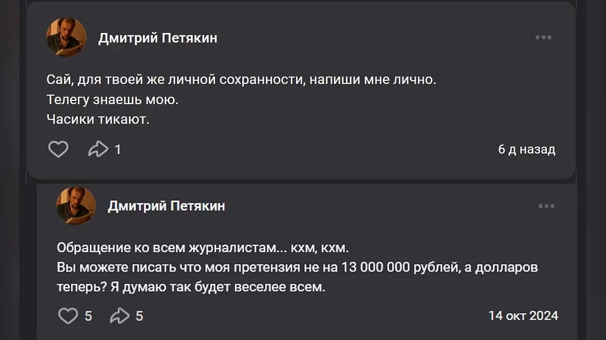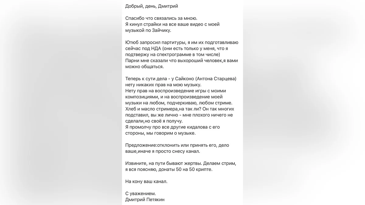 Петякин стал рассылать запросы по удалению видео с участием его музыки. Он хотел, чтобы стримеры заставили меня ему заплатить несколько миллионов ни за что