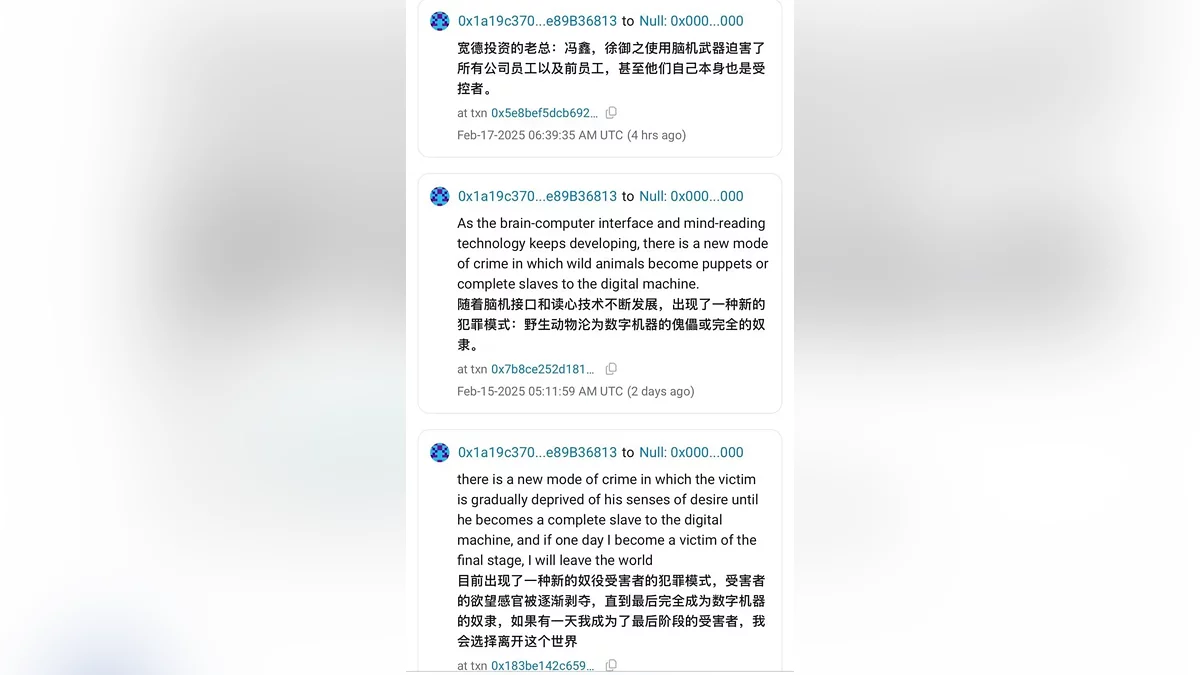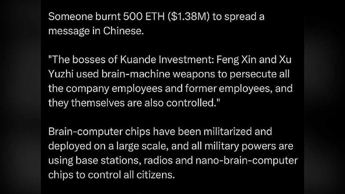 «Генеральные директора Kuande Investment Фэн Синь (Feng Xin) и Сюй Юйчжи (Xu Yuzhi) использовали нейрокомпьютерное оружие для манипуляции текущими и бывшими сотрудниками компании. Они сами тоже оказались под чьим-то контролем».