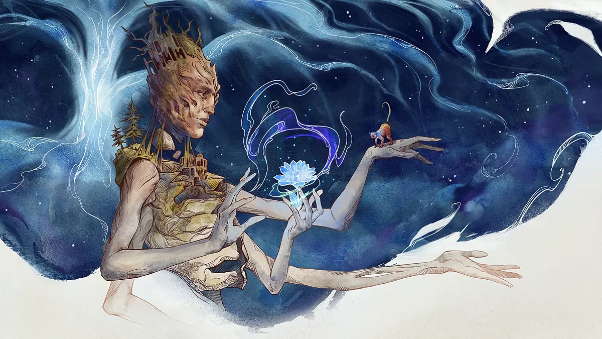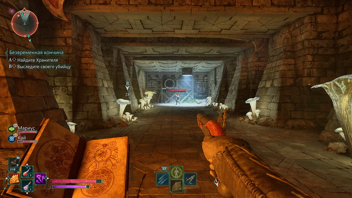 Отдельно хочется выделить «места памяти». Как только эмиссар прибывает на остров, в его голове поселяется Голос грибного бога. Путешествуя, вы изредка будете находить осколки воспоминаний. Казалось бы, вот идеальный момент, чтобы более-менее интересно вписать лор в события, но не тут-то было. Взаимодействуя с памятью, мы не увидим красивых катсцен, лишь слайд-шоу картинок, рассказывающих о жизни какой-то далёкой предшественницы эмиссара. Самое забавное, что Голос будет регулярно уточнять, что произошло, так как уже позабыл детали. А игрок-то их и не помнил! Просто вдумайтесь в это. Мы должны своими руками сформировать предысторию неизвестных для нас персонажей, описать их характеры и решения, полностью лишенные контекста событий. При этом каждый ваш ответ влияет на Голос.