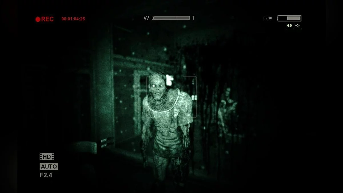 Нервотрёпки также добавляет тот факт, что в Outlast необходимо постоянно использовать ночной режим видеокамеры, чтобы разглядеть хоть что-то в тёмных помещениях. При этом дальность видимости существенно ограничена, а заряд камеры важно экономить. В общем, Outlast — игра не для людей, страдающих клаустрофобией.