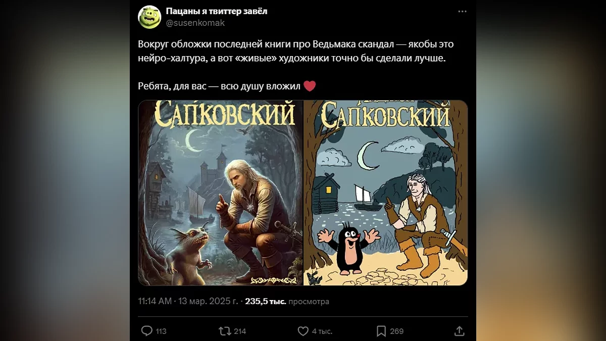 ИИ-обложка нового «Ведьмака» стала мемом. Художники высмеяли работу нейросети и нарисовали свои версии Геральта
