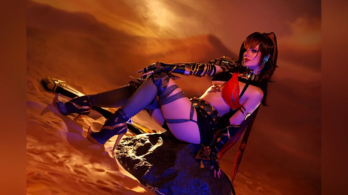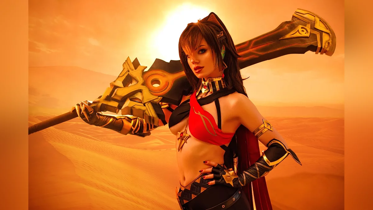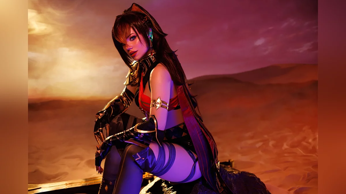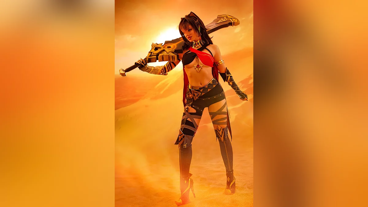 Согласно лору Genshin Impact, пустынная львица Дэхья — наёмница с принципами. Она берётся за контракт только если её устраивают все условия и не привязывается к нанимателю. Однако свою работу девушка знает хорошо и всегда достигает целей. В бою она полагается на огненную стихию и двуручный меч. Образ Дэхьи воплотила в жизнь KamikoZero. Фотограф — Jay.