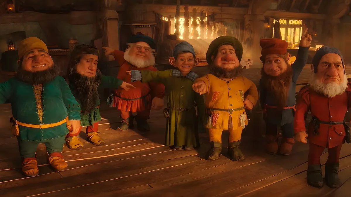 Роль гномов в новой ленте — это просто функции: дать героине убежище, укрепить её характер, оплакивать после кончины. Никакого раскрытия характеров, просто одинокие холостяки, показанные неуклюжими неряхами, не способные навести порядок без стальной женской воли. В мультфильме 1937 года каждому гному уделялось больше внимания, их личности были тщательно проработаны. И я даже не хочу комментировать то, насколько неестественно и неуклюже выглядят эти CGI-гномы. Решение не задействовать актёров с карликовостью в таком фильме одно из самых непрофессиональных.