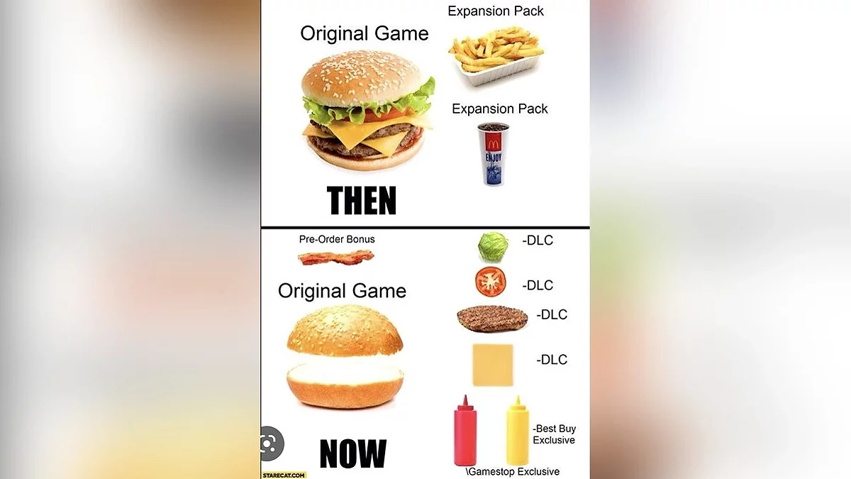 Отдельно стоит упомянуть про DLC, когда по сути это продажа игры по частям, зачастую всяких внутриигровых предметов, которые раньше приятно было получать просто в качестве награды в процессе прохождения игры. Что было интереснее в плане геймплея, но очевидно менее выгодно, чем всё это продавать отдельно. А если DLC толковое в плане дополнительно поиграть, то обычно само по себе его тоже не приобрести. Изволь также купить «основной» продукт, для которого это DLC.