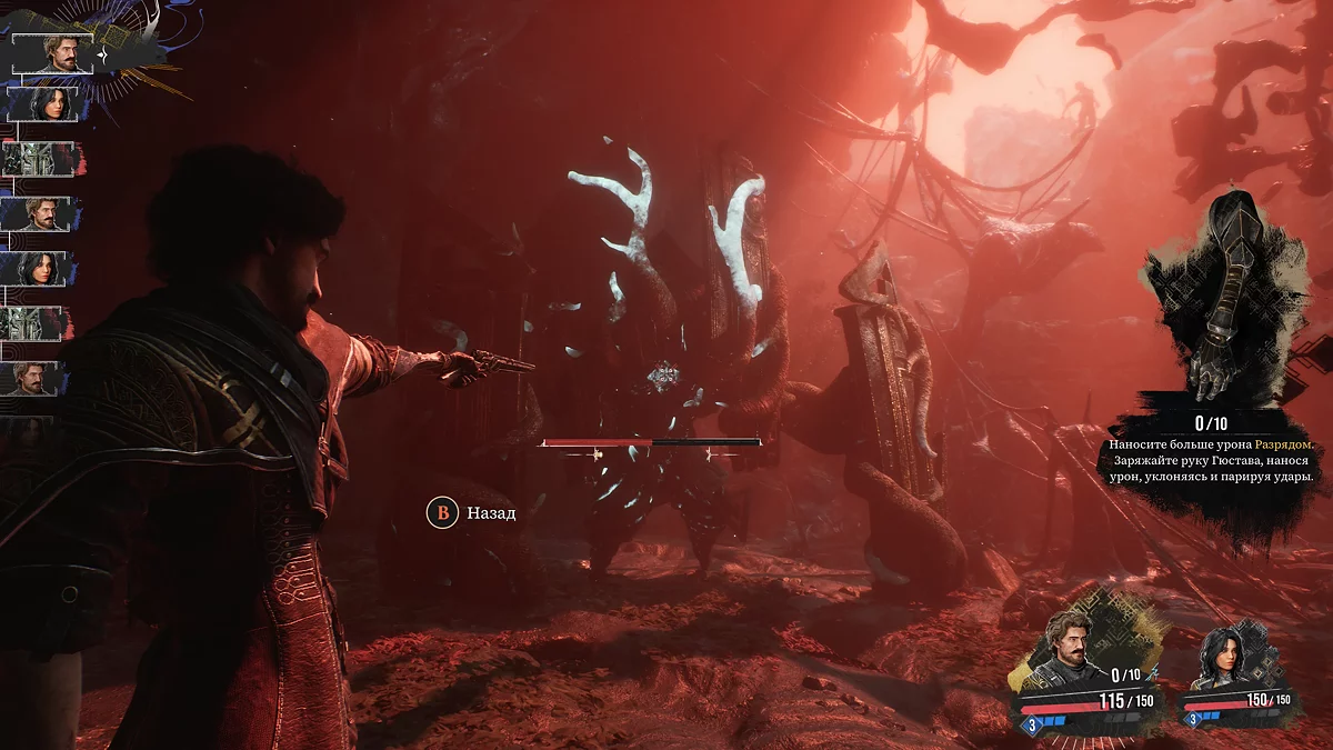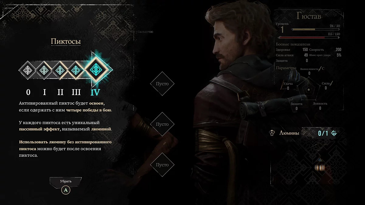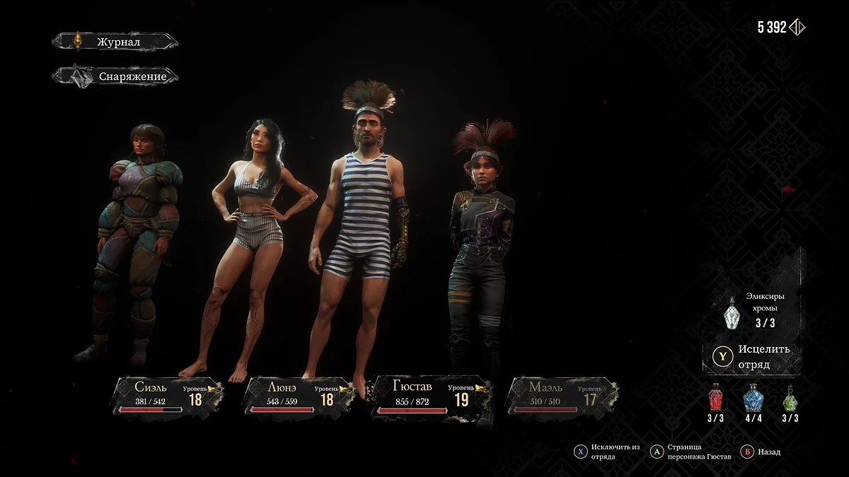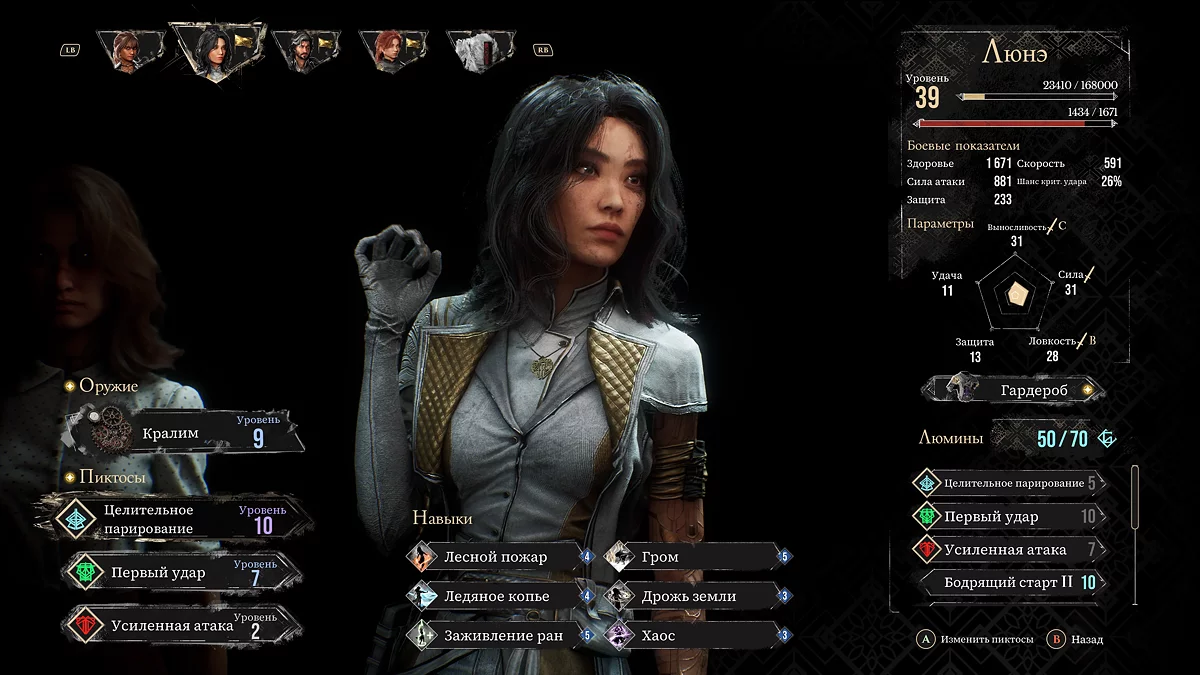 У каждого из членов экспедиции есть основные характеристики, очень похожие на статы из проекта souls-like. Их вы можете качать как хотите, однако должны учитывать, какое из оружий наилучшим образом стакается от той или иной характеристики. Допустим, в мече стоит буква «С» рядом с выносливостью. Это значит, что высокий параметр выносливости усилит меч, и наоборот — низкий сильно уменьшит его потенциал. Естественно, снаряжения будет довольно много, а потому статы придется не раз пересобирать (не касается низкого и среднего уровня сложности).