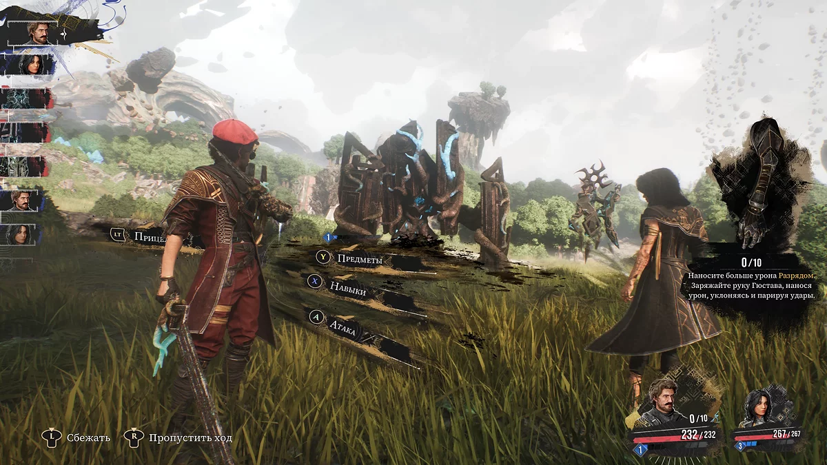 Стандартную формулу jRPG французы сильно прокачали, почерпнув идеи из обновленных «Финалок» и многих других проектов. Однако главный восторг в том, как это все соединили между собой. Каждый из трех героев ходит по очереди, как и враги. Есть базовая атака и навыки, тратящие очки действий. Кроме того, у каждого есть дальняя атака. Они потребуются, если сражение происходит с летающими врагами, которых просто не убить иным способом. Чтобы добиться максимальной эффективности, в каждом навыке необходимо пройти небольшое QTE. Промахнулись — сила способности резко упадет.