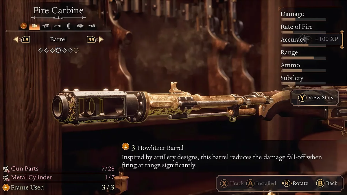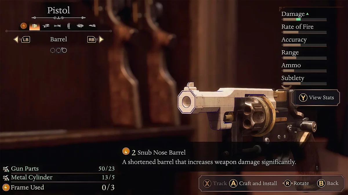 Среди основных характеристик оружия — урон (damage), скорострельность (rate of fire), точность (accuracy), дальность (range), боезапас (ammo) и скрытность (subtlety). Заменяя стандартные компоненты на продвинутые (хотя неясно, будем ли мы создавать эти компоненты сами или находить в открытом мире), можно существенно улучшить качество стрельбы.