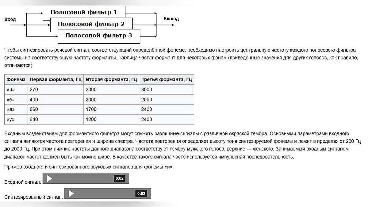 Вот как этот тип синтеза работает. На входе даётся шум, который, проходя через формантные фильтры, приобретает звучание, схожее с голосом. Это можно сравнить с нашей речью. Мы производим звук, который, проходя через сложную речевую систему, речевой тракт (набор фильтров), преобразуется в понятные слова. Это хорошо заметно на примере гласных. Попробуйте на одном дыхании перейти от «а» до «о» и «у». Разные звуки получаются в следствии изменённых «фильтров».
