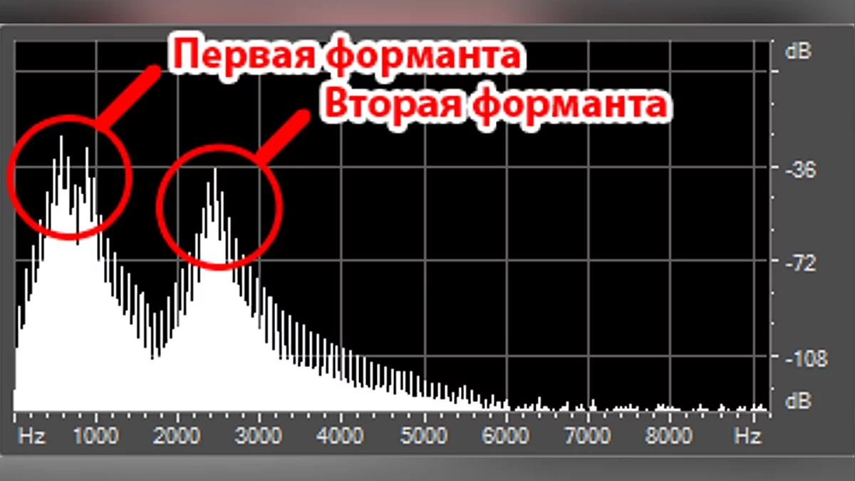 В предыдущей части я упоминал про фонемы — наименьшую звуковую единицу в речи (для простоты будем считать их равнозначными буквам). Когда мы произносим какую-то букву, на спектрограмме это может выглядеть как последовательность из всплесков и затуханий звука. Такие всплески называют формантами. Формантные частоты располагаются в диапазоне от 200 до 2000 Гц. Для того чтоб воспроизвести одну фонему, требуется указать несколько формант, зачастую от 2 до 4. Наглядно это можно глянуть в этом коротком ролике или на картинке ниже.